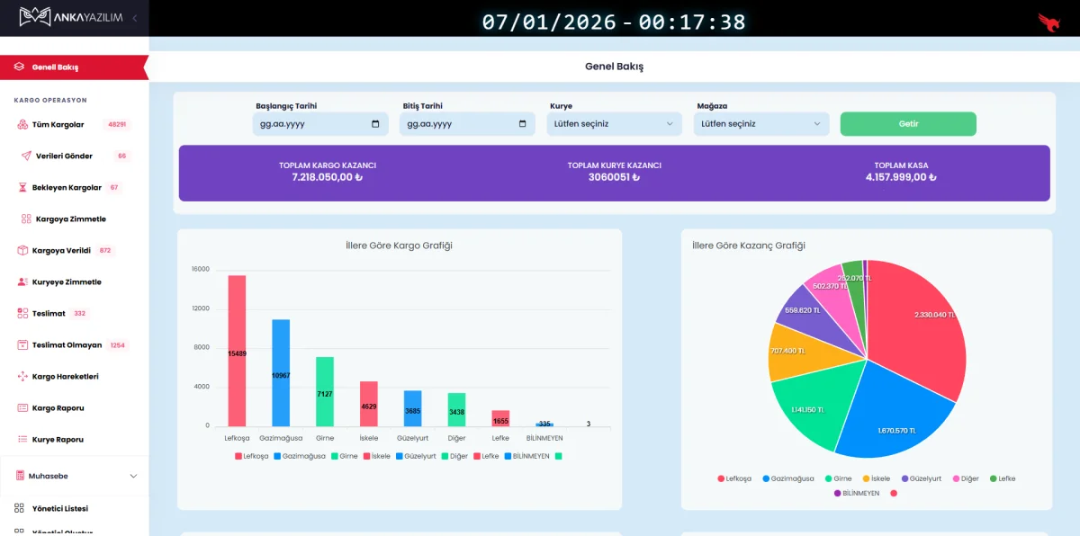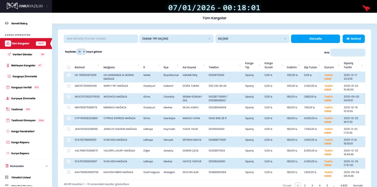 • 🔍 Kargo Takibi ve Görüntüleme: Kargo firması, sisteme atanan veya zimmetlenen kargoların adet, teslimat adresi ve ödeme yöntemi gibi detaylarını görüntüleyebilir. Bu bilgilerle operasyonel planlamalarını yapabilirler.